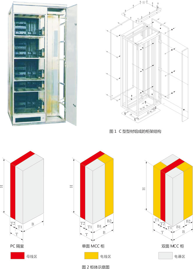 開(kāi)關(guān)柜柜體基本結(jié)構(gòu)是由C型型材料裝配組成。C型材是以E=25mm為模數(shù)安裝孔的鋼板彎制而成。全部柜架及內(nèi)層隔板都作鍍鋅純化處理。四周門(mén)板,側(cè)板則作高壓靜電噴塑。柜體基本結(jié)構(gòu)見(jiàn)圖1所示:柜體基本尺寸如表1表2所示: