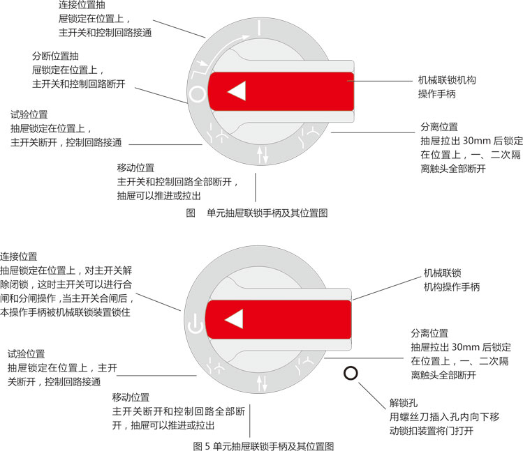 ◎ 抽屜單元有可靠的機(jī)械聯(lián)鎖位置。通過(guò)操作手柄控制,具有明顯準(zhǔn)確的合閘、試驗(yàn)、抽出和隔離位置。操作機(jī)構(gòu)功能見(jiàn)圖4、圖5。